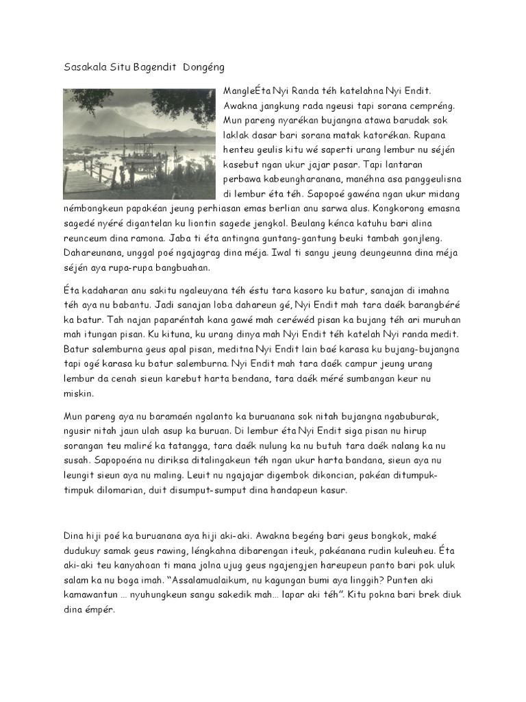 Nah di kesempatan kali ini mari kita lanjutkan dengan cerita tentang situ bagendit dalam bahasa sunda atau cerita asal usul situ bagendit beserta ringkasan dan kesimpulan cerita tersebut. Dongéng arsip kula Kamis 03 April 2014 0818. Dongeng sunda sasakala situ bagendit Di artikel sebelumnya kita sudah menuliskan beberapa contoh dongeng legenda yang ada di jawa barat.